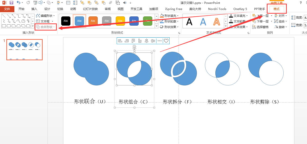 选中形状后,在【格式】菜单左侧,有合并形状图标。